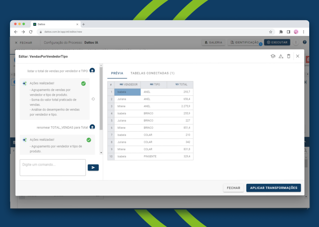 Com uma interface intuitiva em formato de chat, você pode digitar comandos avançados para realizar diversas operações em seus dados e visualizar em tempo real uma prévia do resultado.