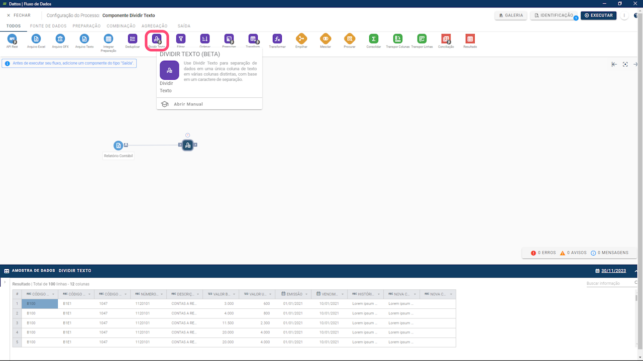 O componente Dividir Texto é utilizado para dividir uma coluna em diversas colunas distintas com base em um caractere de separação. Ou seja, com este componente, o conteúdo de uma única coluna pode ser segmentado em várias colunas separadas, facilitando a organização e visualização dos dados.