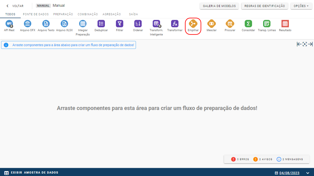 O componente Empilhar permite que a partir de duas fontes de dados você consiga combinar verticalmente diferentes informações em uma tabela única.