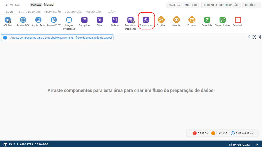 O componente Transformar pode ser utilizado para incluir, excluir, alterar ordem de colunas, além de renomear colunas, modificar o tipo de dados ou criar expressões de cálculos e operações na sua fonte de informação em um fluxo de preparação de dados.