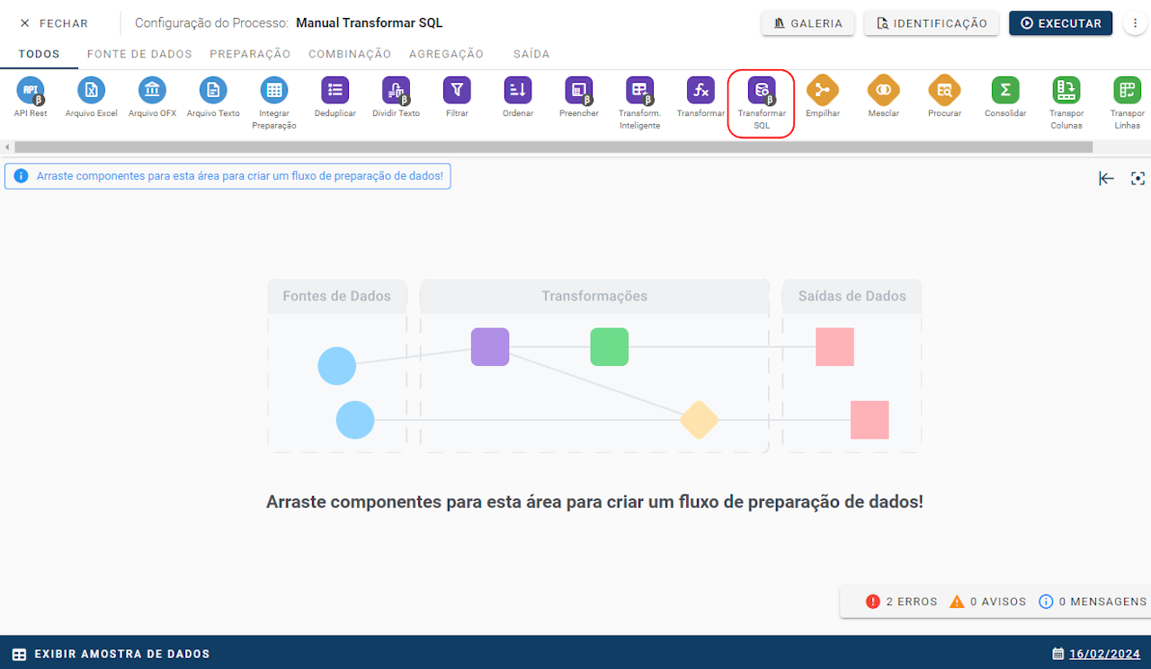 O componente Transformar SQL pode ser utilizado para incluir, excluir, alterar ordem de colunas, renomear colunas, modificar o tipo de dados, agrupar dados ou criar expressões de cálculos e operações na sua fonte de informação em um fluxo de preparação de dados utilizando a linguagem SQL.