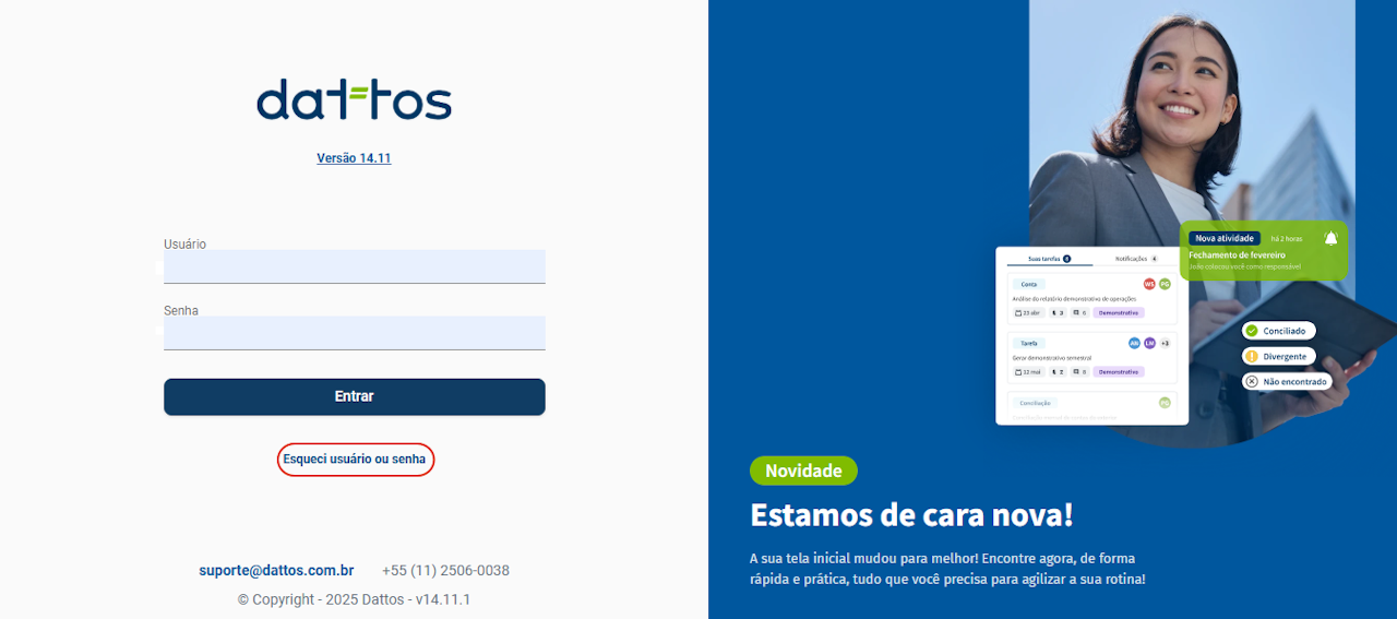 Para iniciar, ao visualizar a tela de login da plataforma Dattos, clique em "Esqueceu seu login ou senha?".